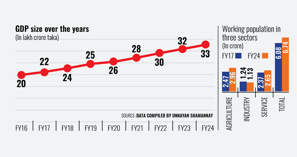 Over the past eight years until fiscal year 2023-24, the country’s economy grew by more than 50 percent, painting a rosy picture of performance by major sectors, while the expansion did not translate into job creation.