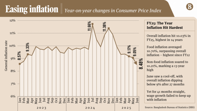 Inflation in Bangladesh has dropped below 9% for the first time in 27 months, according to latest data from the Bangladesh Bureau of Statistics (BBS) released today (7 July).